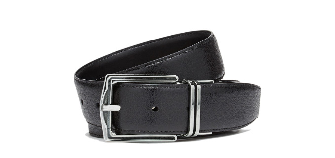 此款黑色双面腰带一面采用压花小牛皮,另一面采用光滑小牛皮,旨在致敬品牌的现代精裁美学风格