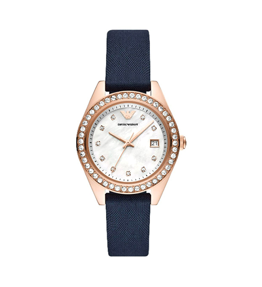 此款 EMPORIO ARMANI 石英腕表,采用简洁表盘,璀璨碎钻环绕,蓝色织布表带,贴合腕间,从容演绎雅致格调。