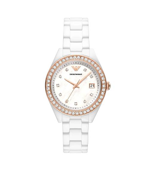 此款 EMPORIO ARMANI 石英腕表,细腻贝母表盘,小巧镶钻细节,时尚徽标点缀,丰盈时光美学。