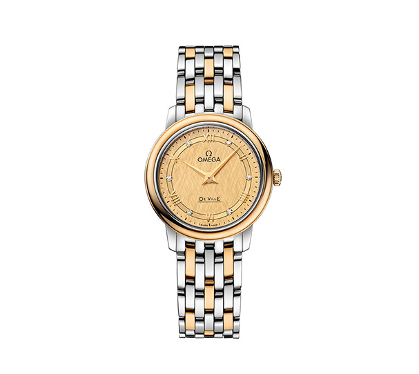 欧米茄碟飞系列典雅腕表以其经典优雅的设计,吸引了众多忠实支持者。此系列表款风格简约,外观雅致华美。该时计表盘为香槟色,呈现出富有光泽感的丝绸纹理。表盘上设有镀金拱形指针,而小时刻度则由6个带有镀金托槽的钻石以及镀金罗马数字组成。27.4毫米表壳采用精钢与黄色18K金打造而成,搭配金色和抛光精钢典雅表链。腕表内部搭载欧米茄1376机芯。